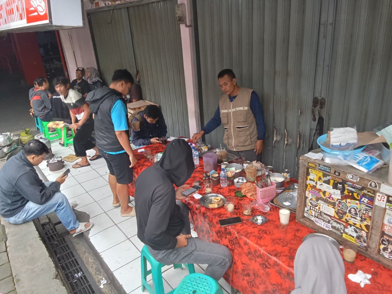 Tak heran, banyak pelanggan yang tak kebagian tempat duduk di meja kayu yang disediakan. Beberapa membawa tikar sendiri, duduk santai di trotoar sambil menyesap kopi dan bercakap ringan.