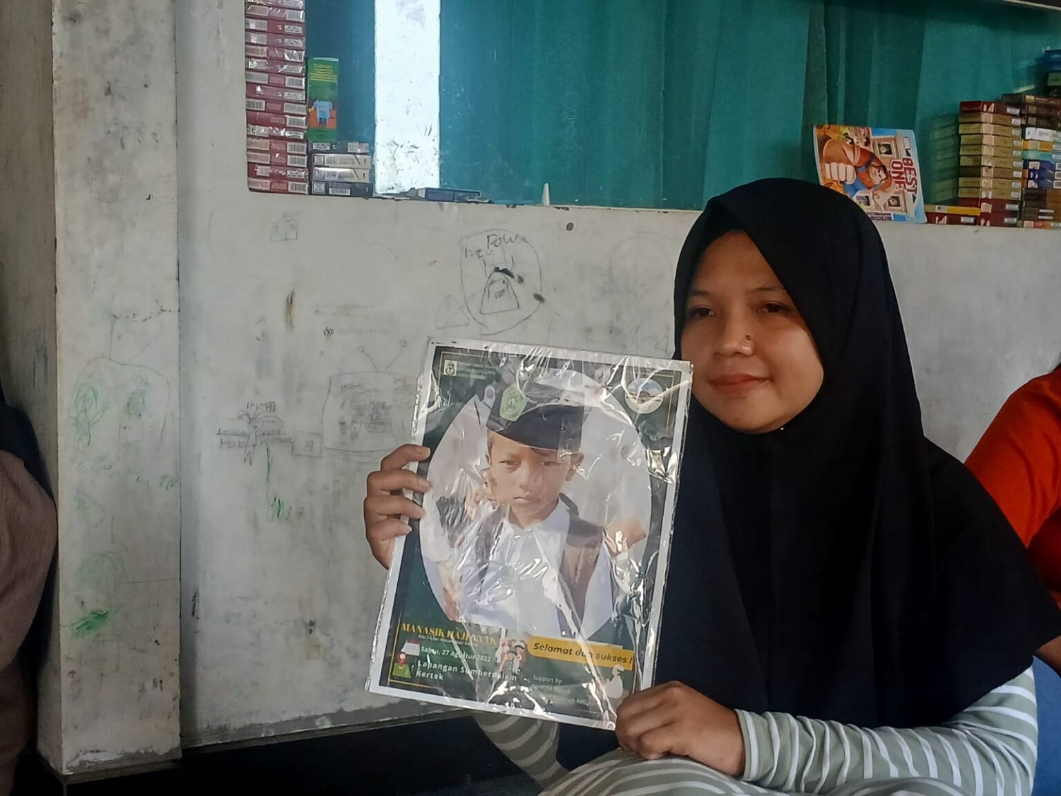 Di pojok ruang tamu, Siti Fatimah duduk dengan wajah menyiratkan kesedihan., Matanya masih terlihat sembab. Ia masih berusaha memahami kenyataan bahwa TA, anak bungsunya yang baru berusia sembilan tahun, kini sudah tiada.