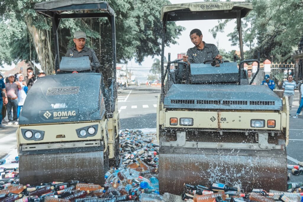 Pemusnahan botol miras dilakukan dengan cara digilas alat berat di hadapan aparat dan masyarakat. Pemerintah ingin menunjukkan bahwa penegakan hukum berjalan transparan serta tidak pandang bulu.