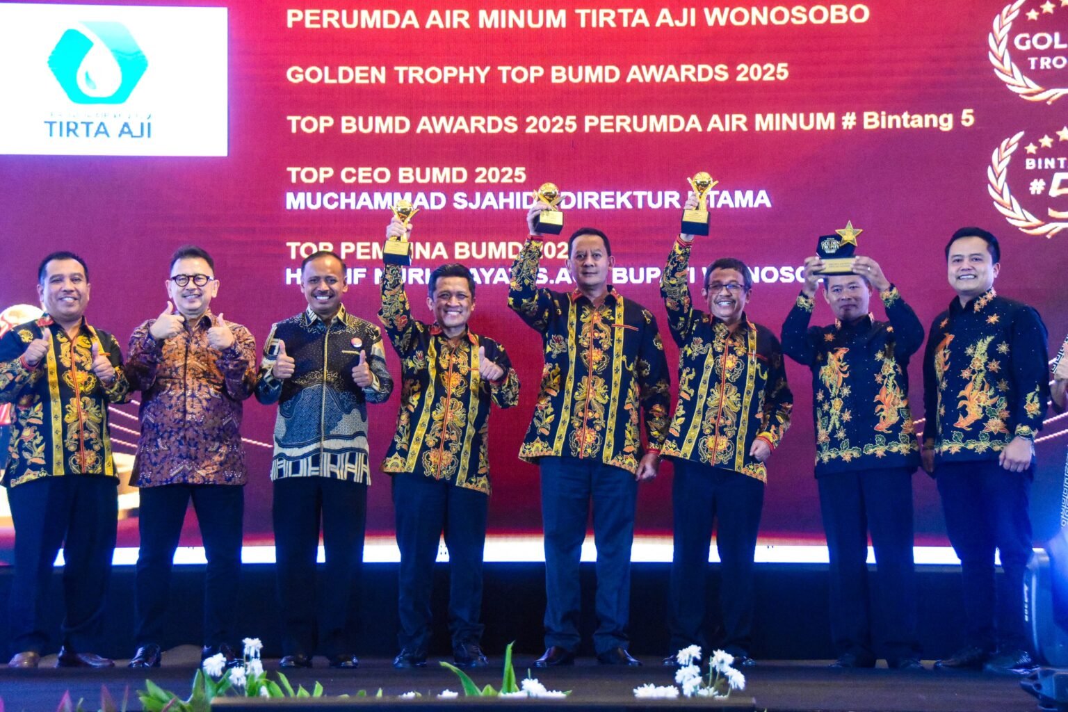 Salah satu sorotan utama adalah raihan TOP BUMD Bintang 4 yang diraih oleh PT BPR Bank Daerah Wonosobo serta TOP CEO BUMD 2025 yang diberikan kepada Direktur Operasional, Galih Pambajeng. Perumda Air Minum Tirta Aji juga mengukir prestasi gemilang dengan meraih TOP BUMD Bintang 5 untuk ketiga kalinya secara berturut-turut, sehingga sekaligus diganjar TOP Golden Trophy. Selain itu, Direktur Utama Perumda Tirta Aji, Muhammad Sjahid, turut dinobatkan sebagai TOP CEO BUMD 2025.
